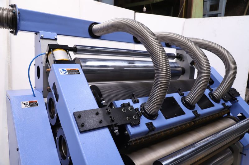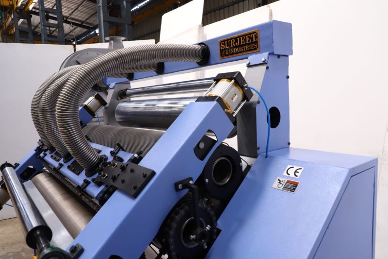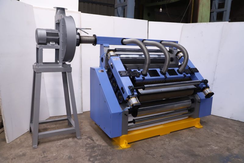 1350 mm Heavy duty high speed single face paper corrugating machine.:- FLUTE ROLL 280MM with Tungsten Coating , Designed Speed 80Mtr/min Equipped With •Fingerless Pneumatic Control. •Electric/Gas/Oil/Steam heating. •Hard And Grind Flute type: A,B,C,E,F (Chose-able options). •Set of fluted rolls and pressure Roll fitted on heavy duty •Roller bearings. •Adjustment of upper corrugating roller and pressure roller is easy controllable. •Pressure Rolls Surface is been Grinded. •Two Pre heaters rolls grinded hard chromed • All Guide Rolls and Pre-Heater rolls surface is been grinded and hard chromed mounted on bearings. •Gap adjustment between glue applicator roller and doctor roller is easy controllable. •Rolls Locking Systems to control displacements of Rolls. •Manual glue width dividing to match the paper width Drive through heavy duty transmission gearbox. •Centralized Lubrication System, with oil seals on bearings to control overflow of oil. •Steel Cover on all moving Parts for safety. Included Heaters Three for Main Rolls& Two for Pre heater Rolls. Included C.E Marked Variable frequency A.C drives & Motor.